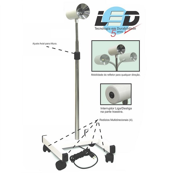 Foco clínico parabólico de luz fria (LED) de alta luminosidade com foco concentrado, suporte flexível em aço cromado, que permite ajuste em todas as posições angulares desejadas, sendo ideal para clínicas, consultórios médicos e unidades de ginecologia. Possui suporte flexível, hastes telescópicas (pedestal) em alumínio cromado para regulagem de altura, base de Aço com pintura eletrostática na cor branca, quatro (04) rodízios com diâmetro de 2”(50,8 mm) para transporte do equipamento, cabo elétrico com dupla isolação e comprimento de 03 (três) metros, plugue e interruptor elétrico (liga/desliga) no corpo do foco de luz.