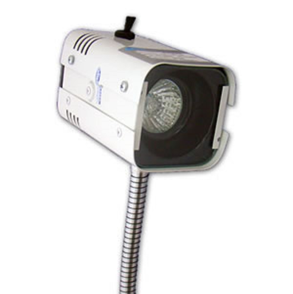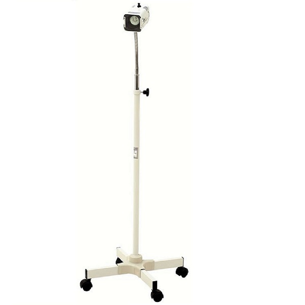 Foco de luz auxiliar para exames clínicos e ginecológicos com haste superior flexível e cromada. Pedestal com haste inferior pintada.